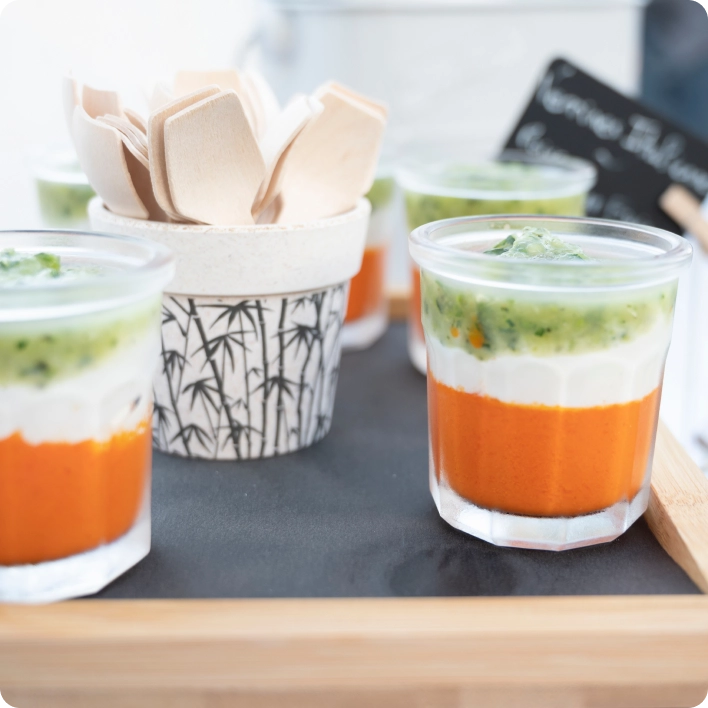 Notre philosophie de respect environnemental nous encourage à fuire l’usage du plastique, nous n’utilisons par conséquent que des contenants lavables ou biodégradables.